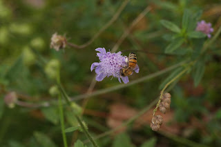 Noch stehen viele Trockenrasenpflanzen in spätsommerlicher Blüte und werden auch eifrig von Bienen besucht.
